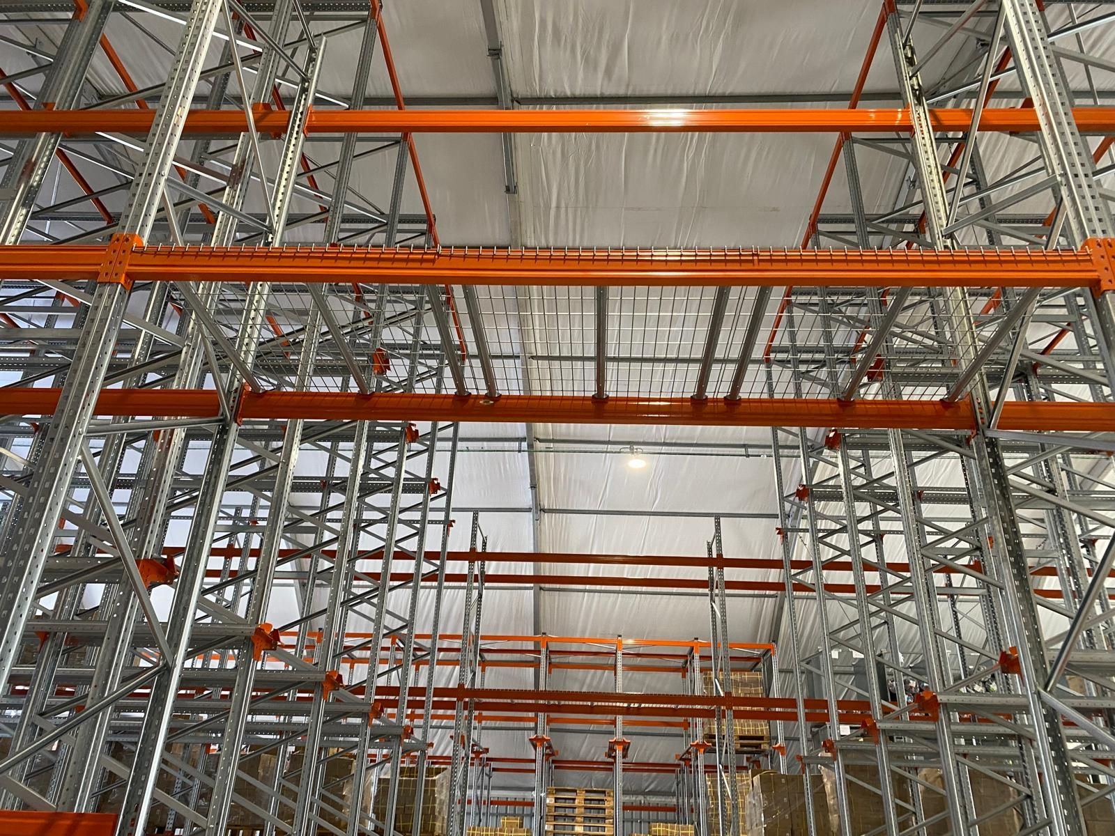 Además, se ha incorporado mallas anticaída en la zona de paso, lo que aporta seguridad al evitar la posible caída de materiales y proteger tanto la mercancía como al personal. Este sistema resulta ideal para almacenar distintos tipos de palets, asegurando una gestión eficaz del inventario y un acceso rápido a los productos cuando se necesitan.