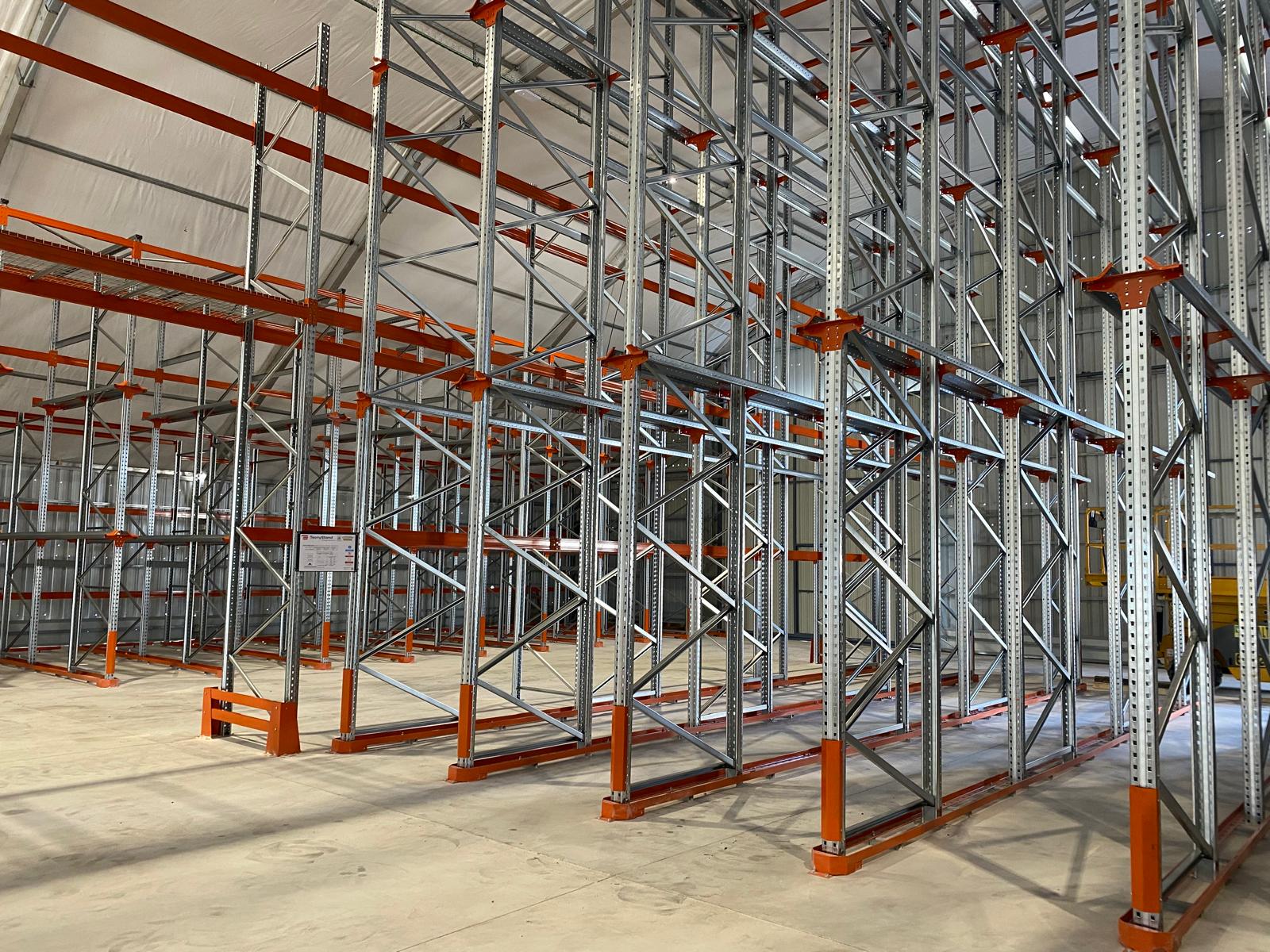 Se ha instalado una estantería industrial formada por 8 módulos de 3.300mm de largo y 1.100mm de fondo, con una altura total de 6.000mm y una distribución de suelo más 3 niveles.