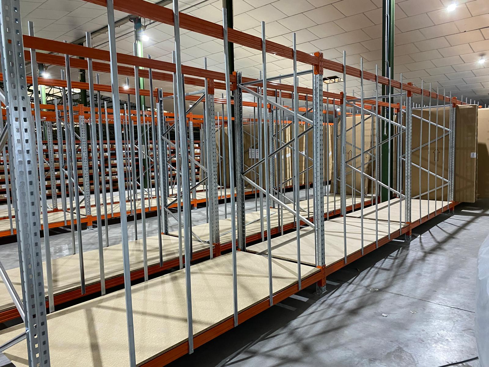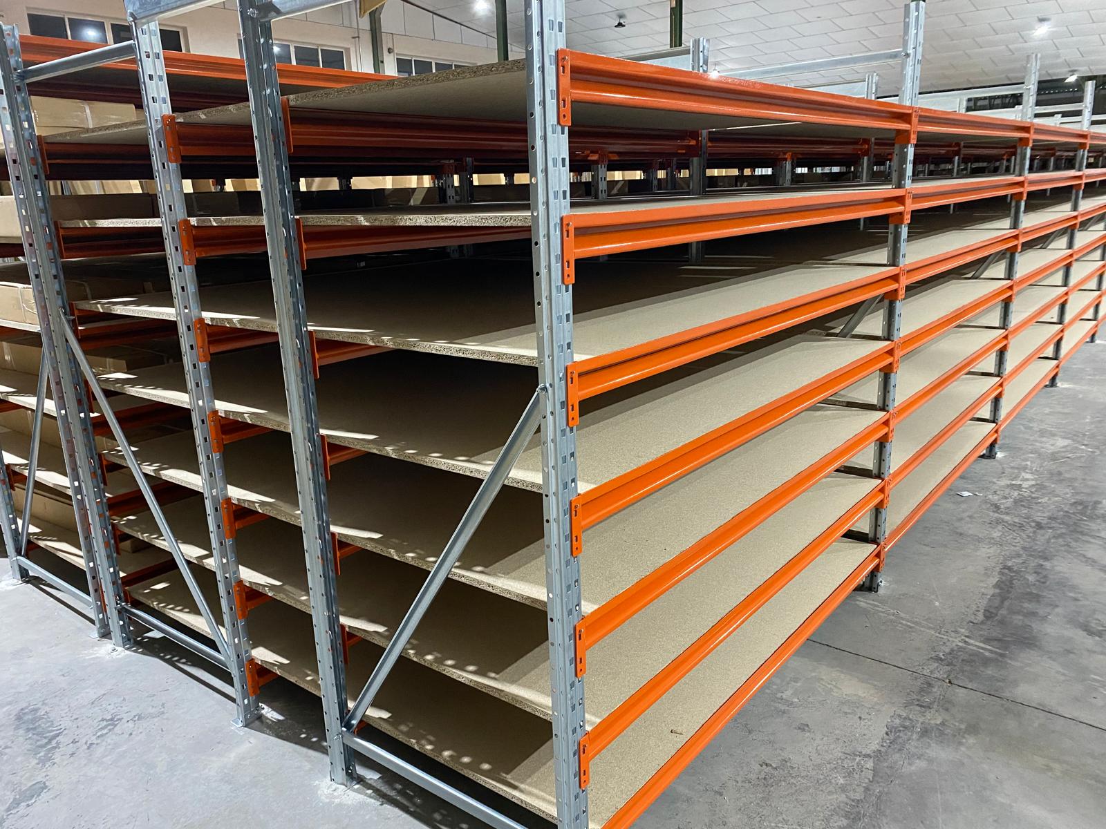 Se han instalado cuatro estanterías de carga pesada, compuestas de 5 módulos de 2.700mm de largo, 1.200mm de fondo, una altura total de 2.500mm y una distribución de 1 nivel.