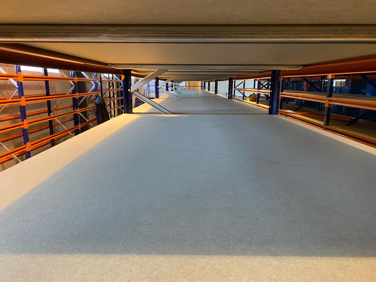 La entreplanta instalada duplica el espacio de almacenamiento en altura de almacén, alcanzando una altura total de 2,5 metros. Cuenta además con una escalera de acceso, una barandilla, una barrera de seguridad y además, el suelo es de tablero aglomerado.
