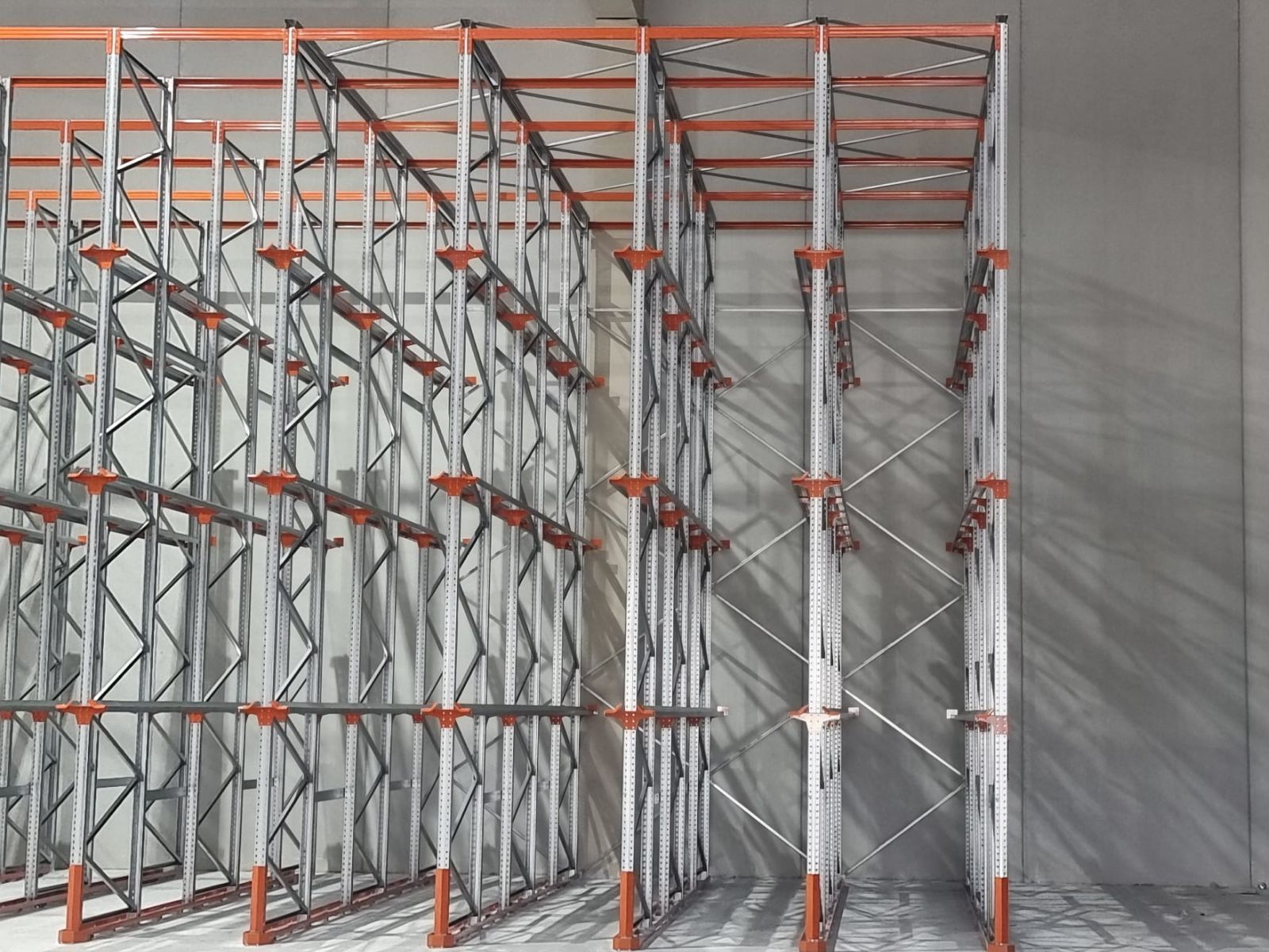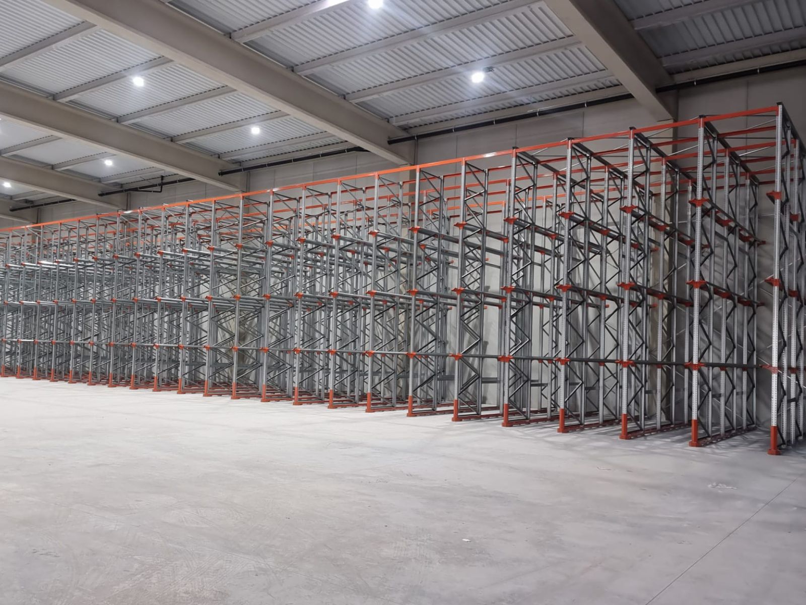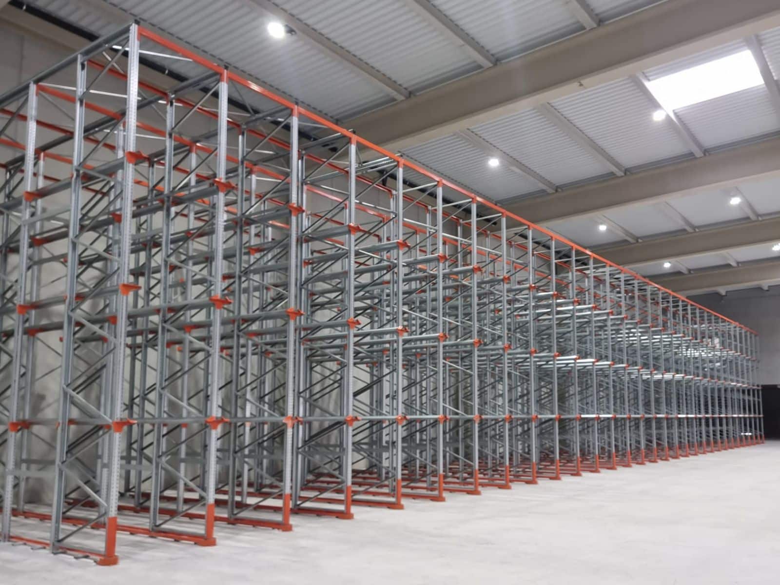 Las estanterías drive in instaladas alcanzan una altura de 7’5 metros y permiten una capacidad total de almacenamiento de 720 palets con dimensiones de 1.200 x 1.200 x 1.600 mm (incluyendo carga y palet).